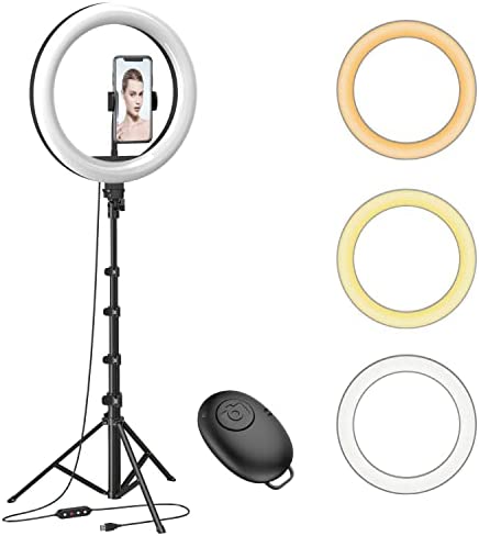Dimmable LED Ring Light – Has 120 LED lamp beads for long life without changing bulbs, 3 colors lighting mode: white, warm yellow, and warm white. Each lighting mode has 10 adjustable brightness to choose from, easy control on cord to power on/off or switch to the lighting mode you prefer, this ring light makes every photo and video look more professional.