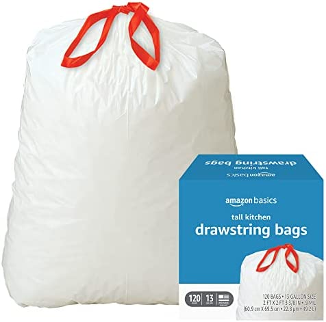 Amazon Basics Tall Kitchen Drawstring Trash Bags, 13 Gallon, 120 Count