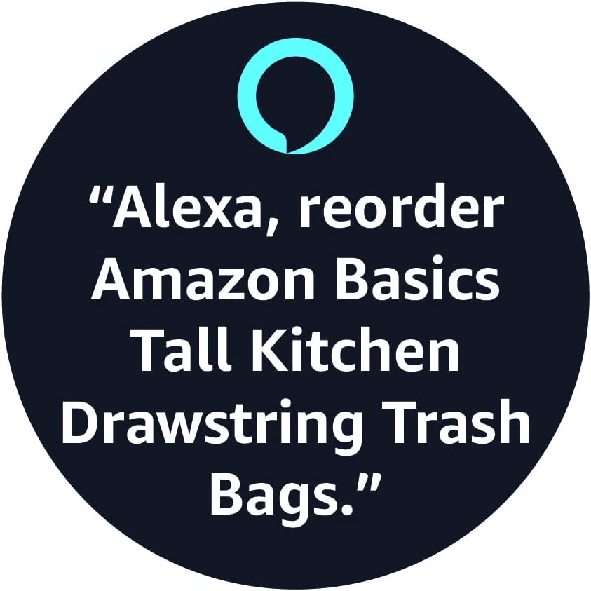 Alexa voice shopping enabled: to place your next order, just say, “Alexa, reorder Amazon Basics Tall Kitchen Drawstring Trash Bags.”