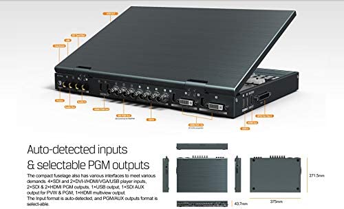 Features Uncompressed capture for live streaming, comply with UVC & UAC Portable All-In-One design with 15.6 inch FHD LCD display for multiview 6 channel inputs: 4×SDI and 2×HDMI/ DVI-I/ VGA/ USB 1×USB type-C out, 3×SDI PGM/ AUX out 2×HDMI PGM & 1×HDMI multiview out Multiformat input auto-detected and PGM/AUX output format selectable T-Bar/ AUTO/