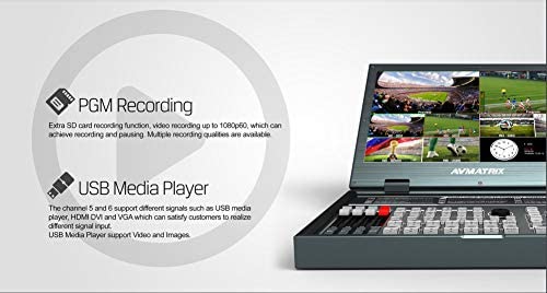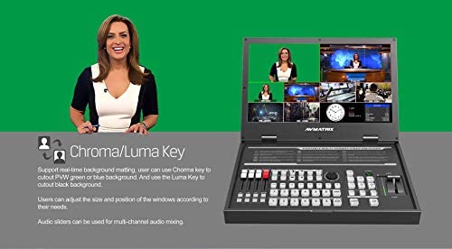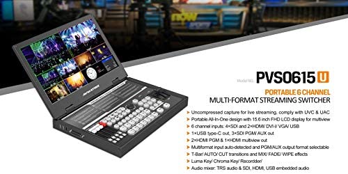 AVMATRIX PVS0615U 15.6 Inch Portable 6 CH Multi-Format Streaming Switcher with USB Capture For Streaming and T-Bar Transition Uncompressed capture for live streaming, comply with UVC & UAC Portable All-In-One design with 15.6 inch FHD LCD display for multiview 6 channel inputs: 4×SDI and 2×HDMI/ DVI-I/ VGA/ USB 1×USB type-C out, 3×SDI PGM/ AUX out 2×HDMI PGM & 1×HDMI multiview out Multiformat input auto-detected and PGM/AUX output format selectable T-Bar/ AUTO/ CUT transitions and MIX/ FADE/ WIPE effects Luma Key/ Chroma Key/ Recordder/ Audio mixer: TRS audio & SDI, HDMI, USB embedded audio