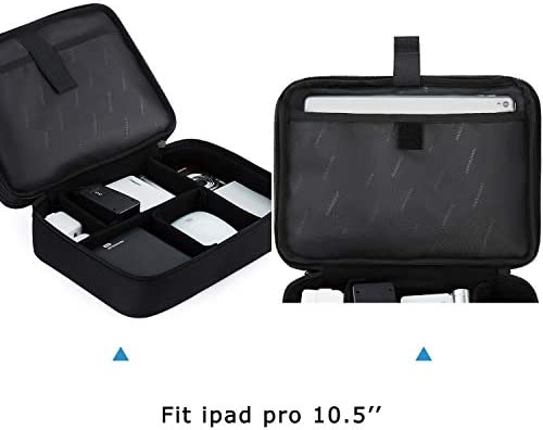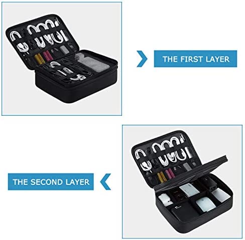 Spacious – 2 double layer. The first layer to organize small items like cables, USB, chargers.The second layer to store larger ones, like bulkier wires, power supplies, adapters, external hard drives, 10.5″ tablet or kindle and other travel accessories