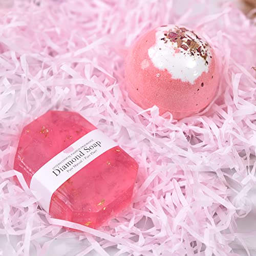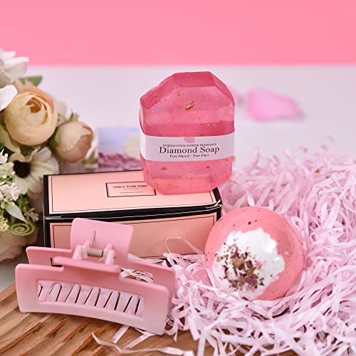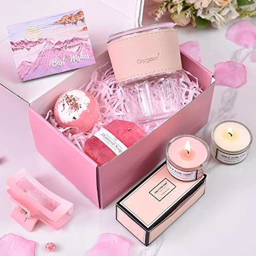 Unique Gift Ideas for Women:This birthday gift basket for women contains 6 gifts beautifully packaged.One pink drinking glass,one pink rose bath bomb, one pure manual diamond soap, two Soy Wax flowers and fruit scented candles ,one pink hair clip and an oil painting style greeting card.