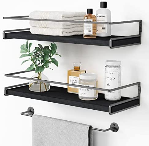 Black Floating Shelves for Bathroom Wall Set of 2, Bathroom Floating Shelf with Tower Bar and Holder, Rustic Wood Hanging Shelves for Bedroom, Kitchen Organizer, Closet Storage (Black-Grey)