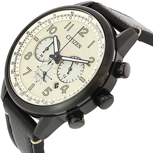 Beige dial. Black-plated stainless steel case with a black-plated stainless steel band. Eco-Drive movement. 100 meters / 330 feet water resistance. Fixed bezel. Fold Over with Push Button Release clasp. Case size 43 mm x 13 mm. Citizen CA4425-10X Watch.