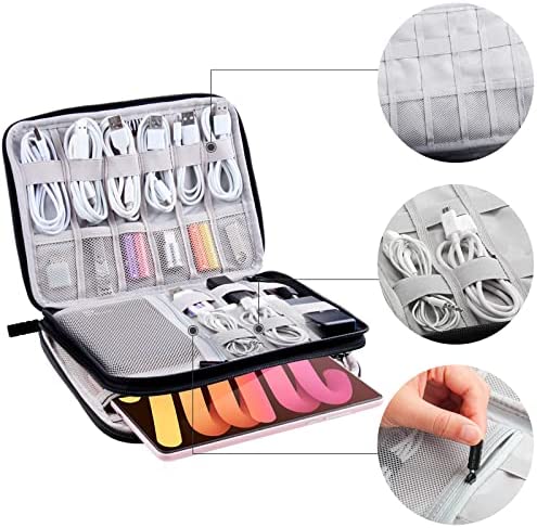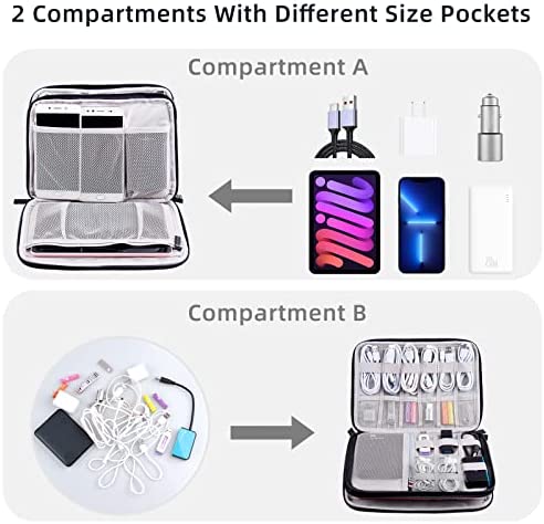 【DOUBLE COMPARTMENTS & DURABLE】: Electronic organizer travel case is made of durable, water-resistant, and scratch-resistant nylon fabric and double layers design, enough space to hold all your electronic accessories such as cables, chargers, power banks, phones, USB drives, Ipad mini, fire tablet, kindle and other tech gadgets.