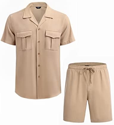 【Versatile】The men’s button down linen shirts can match with shorts, pants, trousers or jeans. The casual linen shorts can match with t-shirts, tops, tanks. You can match the 2 piece shirt and short set with sunglasses for creating a stylish leisure style, or pair it with flip flops and a sun hat for beachwear.