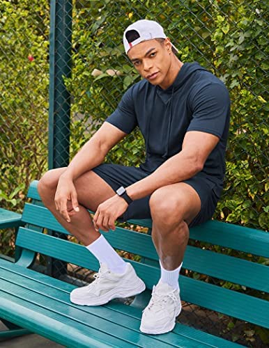 Two Piece Tracksuit Design: Mens gym hoodies pullover with durable kangaroo pocket, adjustable drawstring hood, short sleeve, muscle fit, classic hooded T-shirt. Sports shorts with 2 side pockets and 1 back pocket for storage. Adjustable drawstring elastic waist design allows you to adjust your waistline for maintain high performance during exercise.