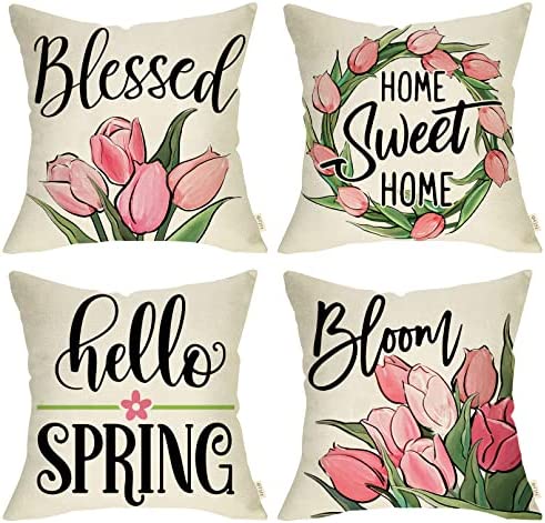 Special Pattern: These 4 PCS 18 × 18 inches decorative pillow covers are single-sided printed with pink tulip wreath. The spring series of four-piece pillowcases are printed with ‘hello spring’,’sweet home’ ,’blessed’ and ‘bloom’, this simple spring flower four-piece suit is very suitable for friends or family who like tulip. They also can be used as a memorial gift for loss of loved one, or a condolence and sympathy gifts