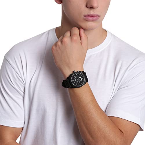Black stainless steel case with black dial; black silicone-coated stainless steel bracelet band; links can be removed for a customized fit; interchangeable with all 24mm Fossil watch straps