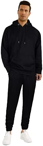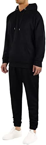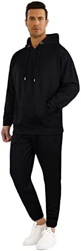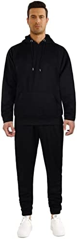 Features:Mens 2 piece athletic tracksuits:long sleeve pullover hoodie sweatshirt with 2 side pockets,drawstrings,ribbed hem and cuffs; Pants with full length, 2 side pockets, gathered ribbed ankle, elastic waist design with a drawstring to stay comfortable during exercise.