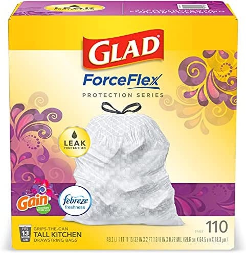 Fight nasty kitchen odors with Glad trash bags and the steady release of Febreze freshness. Glad Tall Kitchen Drawstring Trash Bags are designed with ForceFlex technology to give extra flex as it expands around sharp edges and heavy loads, so you can pack it in while resisting tears, rips and punctures. A steady release of Gain Moonlight Breeze scent with Febreze Freshness keeps your kitchen pleasantly fresh smelling with long lasting odor control. Let the stretchable strength of Glad handle all the messes our busy daily life can throw at it and then some. With double-sided seals and a reinforced bottom, these bags are designed with RipGuard and LeakGuard technology to prevent seepage of liquids and keep trash contained. The durable Grips-The-Can Drawstring ensures a tight grip on the trash can to keep it in place. Take the trash to the curb with no fear of leaks and tears, and no frustration. Keep your kitchen smelling clean with the stretchable strength of Glad. Comparable to simplehuman H, Q, P, K, M, N, J can liners and fit with simplehuman 58L Rectangular Dual Compartment Kitchen Step Trash Cans, 50L Rectangular Kitchen Step Trash Cans, 40L Slim Kitchen Step Trash Cans, 45L Rectangular Kitchen Step Trash Cans, 45L Slim Kitchen Step Trash Cans.