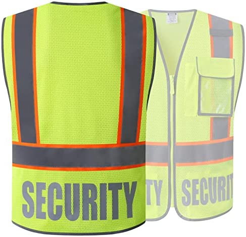 DESIGN: 5-Pockets SECURITY Vest | Neon Yellow with Orange edge trim | comes with a 2-tiers pocket with a pocket window for ID Badge and a pouch for a small flashlight. 2 Velcro closure pockets at waist level for extra storage | The Word SECURITY is printed on both sides.