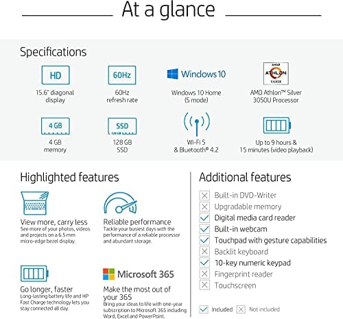 【AMD Athlon Silver 3050U】HP 15.6″ Laptop with AMD Athlon Silver 3050U (2.3 GHz base clock, up to 3.2 GHz max boost clock, 4 MB L3 cache, 2 cores), Uplift your performance and multitask seamlessly with accelerated power and efficiency, while enjoying stunning HD visuals.