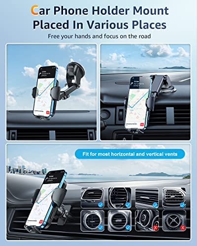 [4 in 1 Cell Phone Holder for Car] Are you not sure which installation method is better for your car? No worries! The 4 in 1 car phone mount can be flexible placement. Dashboard & Windshield & Air Vent & Desk, all places work perfectly. Also, with low temperatures in winter and heat in summer, you can choose to avoid the issue caused by environmental influences. Suitable for all cars like sedan, pickup trucks, suv, taxis and more