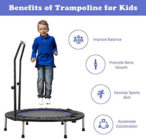 🤸♀️ The padded handlebar is adjustable ranging from 33’’ to 42’’ high that fit to user’s height. Using the handlebar for easy grip to control your bounce. The frame cover is also padded that provides safer jump surface