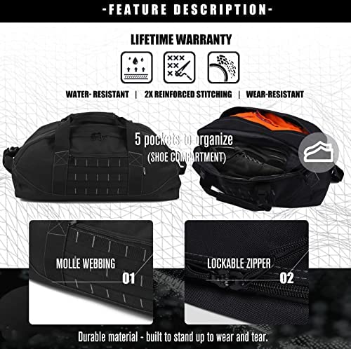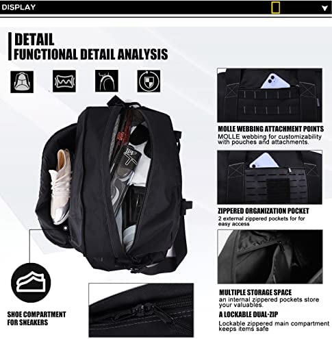 【Tactical Duffle Bag with Shoe Compartment】Sport gym bag offers a lockable dual-zip (lock not included) main compartment that provides secure storage for dry & clean clothes or everything for gym & traveling you necessary,A separate zippered compartment on the outside acts as a shoe compartment to keep your footwear separate from other gear.