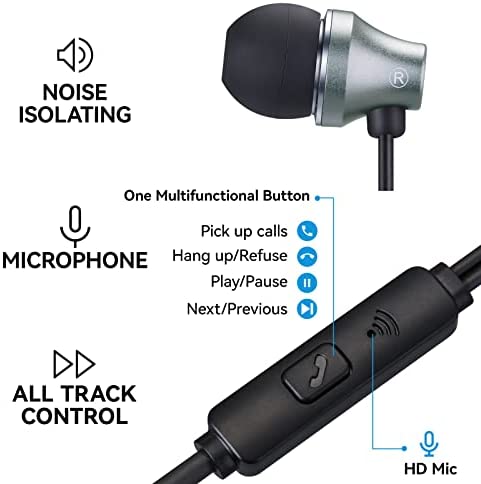 In-ear wired headphones with built-in microphone and one multifunctional button. Multifunctional button can pick up/end calls, play/pause music and rewind/fast-forward songs. Easily control phone calls and music with one button.