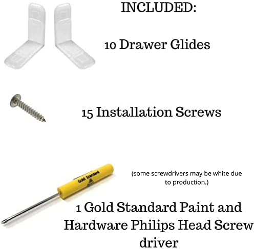 Set of 5 Kenlin Rite Trak II drawer guides with metal backing plates, drawer stop with roller, screws, GSPH screwdriver, and corner glides