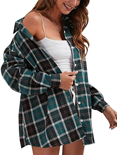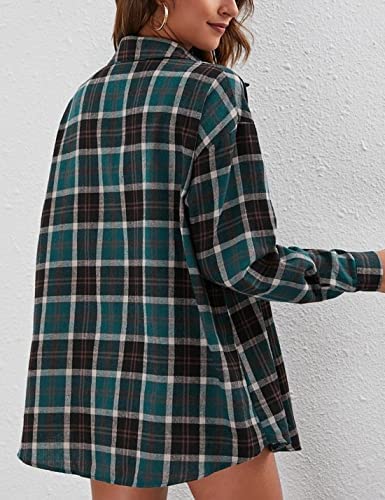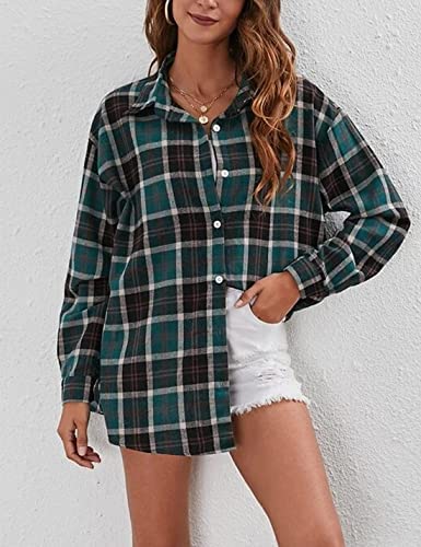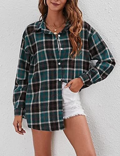 Oversized long sleeve shirts for women, plaid printed, lapel collar, single button cuffs and curved hem, comfy baggy drop shoulder flannel shirts blouse