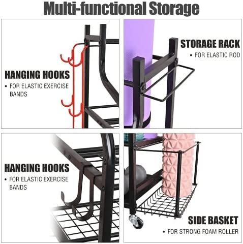 Mythinglogic Yoga Mat Storage Racks,Home Gym Storage Rack for Dumbbells Kettlebells Foam Roller, Yoga Strap and Resistance Bands, Workout Equipment Storage Organizer With Hooks and Wheels