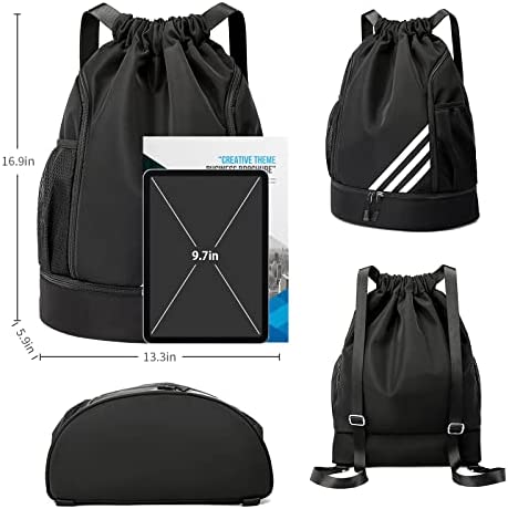 Oziral Drawstring Backpack Water Resistant String Bag Gym Sports with Shoe Compartment Side Mesh Pockets for Women Men Children(Black)