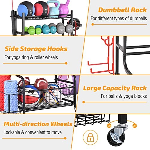 PLKOW Dumbbell Rack, Weight Rack for Dumbbells, Home Gym Storage for Dumbbells Kettlebells Yoga Mat and Balls, All in One Workout Storage with Wheels and Hooks, Powder Coated Finish Steel