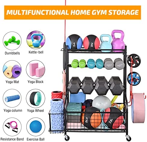 🤸♀️【Extra Large Capacity】: Our workout storage rack equipped with 3 layers of dumbbell storage racks, a side basket for yoga mat and foam roller, several side storage hangers for storing resistance band and roller wheels. Bottom storage rack is perfect for storing balls, yoga blocks and other exercise equipment.