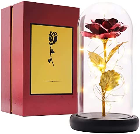 High- Quality Galaxy Glass Rose Gift-The red galaxy glass rose light comes in an elegant glass dome made of excellent materials with warm LED string lights, premium plastic red rose, black wooden base. Our galaxy glass rose can be light up, never fade, just like love to lover, wife, girlfriend. Beautiful flowers for Valentines day.