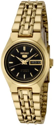 Simple, classic, and well-made, the Seiko Women’s Stainless Steel Watch features an all-gold palette with a pop of deep black tones for drama and interest. Thanks to its battery-free 21-jewel Japanese automatic movement. To power this watch, simply move your arm. As stylish as it is convenient, this watch has a black dial with bar hour markers, three gold hands, and English/Spanish day and date display at three o’clock. Black-toned indices make for easy timekeeping, while water-resistance to 99 feet (30 meters) and a Hardlex crystal guard against wear and tear. Comfortable and secure on the wrist thanks to a finely detailed bracelet band, this watch will see you through work and weekends with ease. It arrives in a Seiko box that’s ideal for gift-giving or storage.