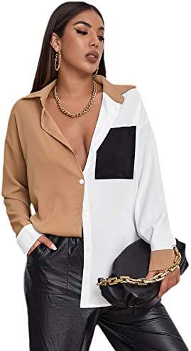 SheIn Women’s Color Block Button Down Blouse V Neck Long Sleeve Collar Oversized Shirt Tops