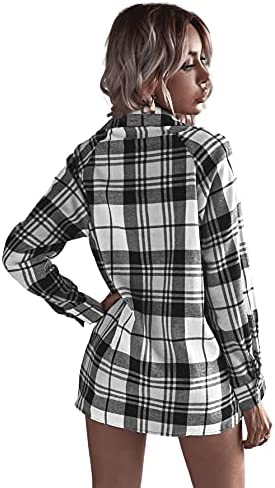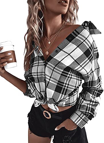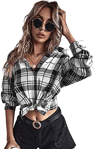 SheIn Women’s Plaid Long Sleeve Blouse Button Up Lapel Collar Tunic Tops Shirts