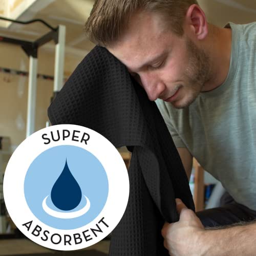 One 6 pack of honeycomb black sweat towels for gym measuring 16 inches by 27 inches