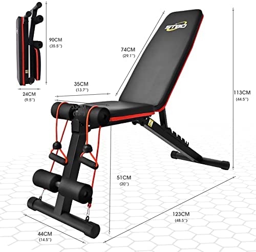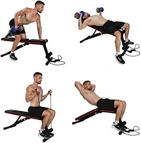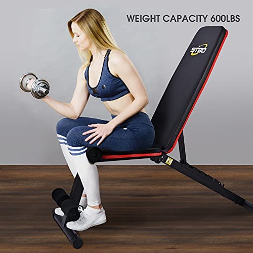 【HEAVY DUTY STRUCTURE & STURDY】: This adjustable weight bench only weighs 28LBS but can withstand 600 LBS capacity,thickened 2 inches steel pipe,heavy duty steel frame, height adjustable non-slip foot cover,these can ensure the adjustable weight bench stable.