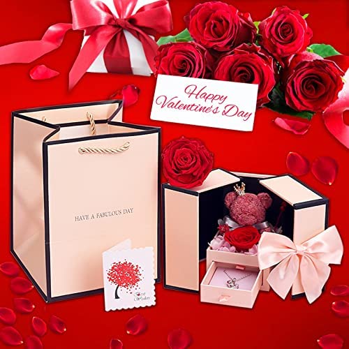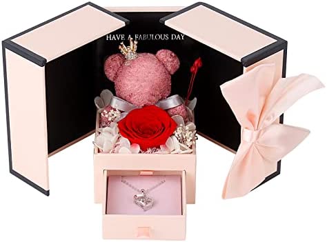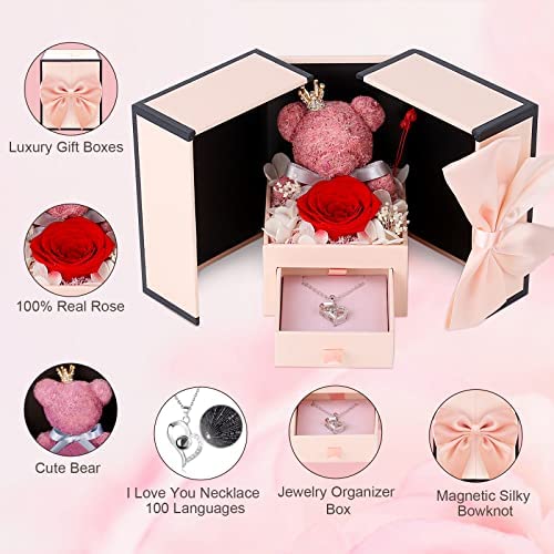 Valentines Day Gifts for Her Cute Preserved Real Red Rose Bear Gifts Box with I Love You Necklace -Eternal Flowers Rose Gifts for Mom Girlfriend Wife on Valentines Day Mothers Day Anniversary Birthday