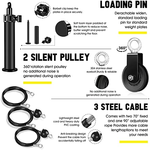 💪【Easy to Assemble, Versatility Workout】Just thread the loading pin through the central hole of a weight plate and connect the sections of cable machine attachments. The lat pull down pulley system can be easily connected to the power racks, squat rack, pull-up bars, cable machine, beams and any place where the strap can be installed. It provides great versatility for your home gyms, garage, training studios, physical therapy centers and various workout environments.
