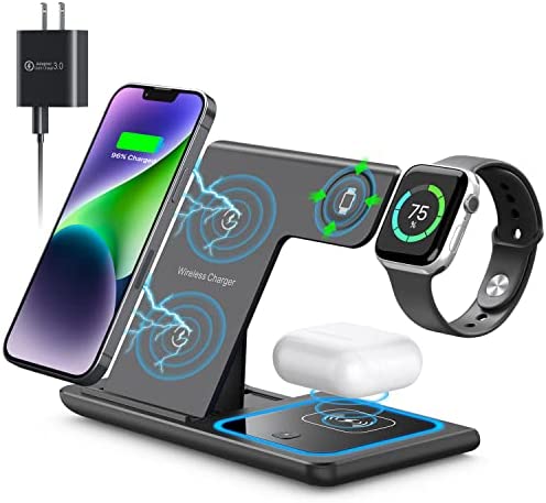 ✅【Ultra Safe 3 in 1 Charging Station】: Fast iphone charging station design. With over-current protection, over-voltage protection and over-temperature protection as well as foreign object detection function. Reasonable internal circuit design can prevent overcharge damage to the equipment battery and ensure safe charging of the device.(Note: remove the magnetic or metal accessories from the phone case when charging.)