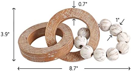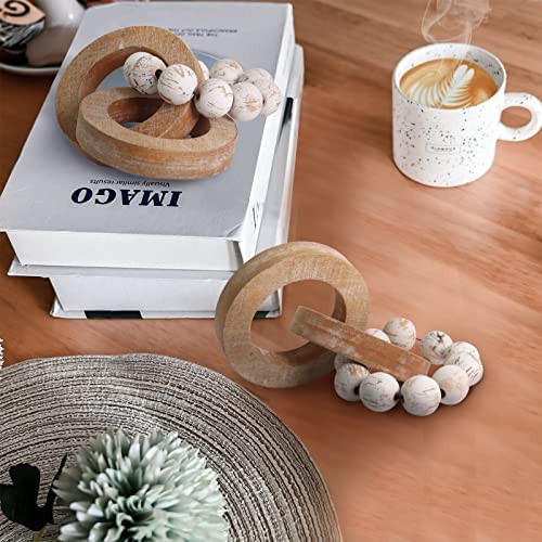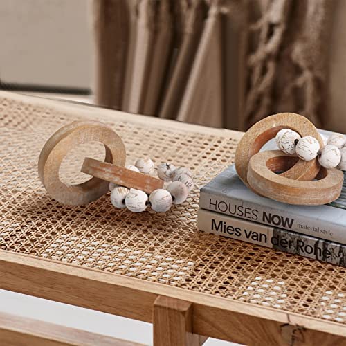 Wood Chain Link Decor for Coffee Table, Handmade Carved 3 Link Wood Knot & Wood Bead Decor, Natural Wooden Chain Link for Boho Farmhouse Country Home Decor, Best Housewarming Gifts (2 Pcs, 8.7inch)